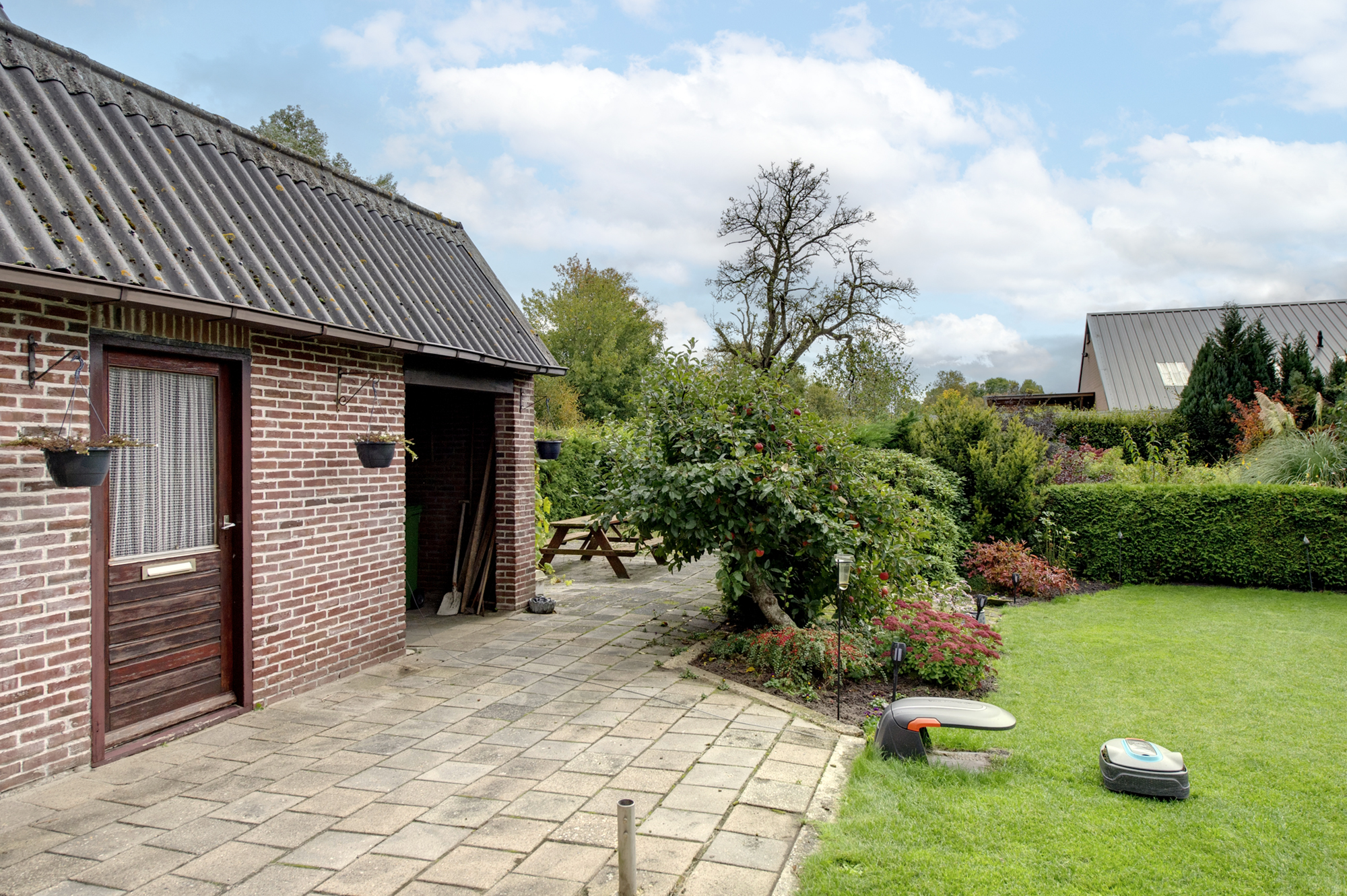 Achter de garage bevindt zich een aangebouwde stenen berging en een overkapping.