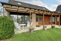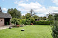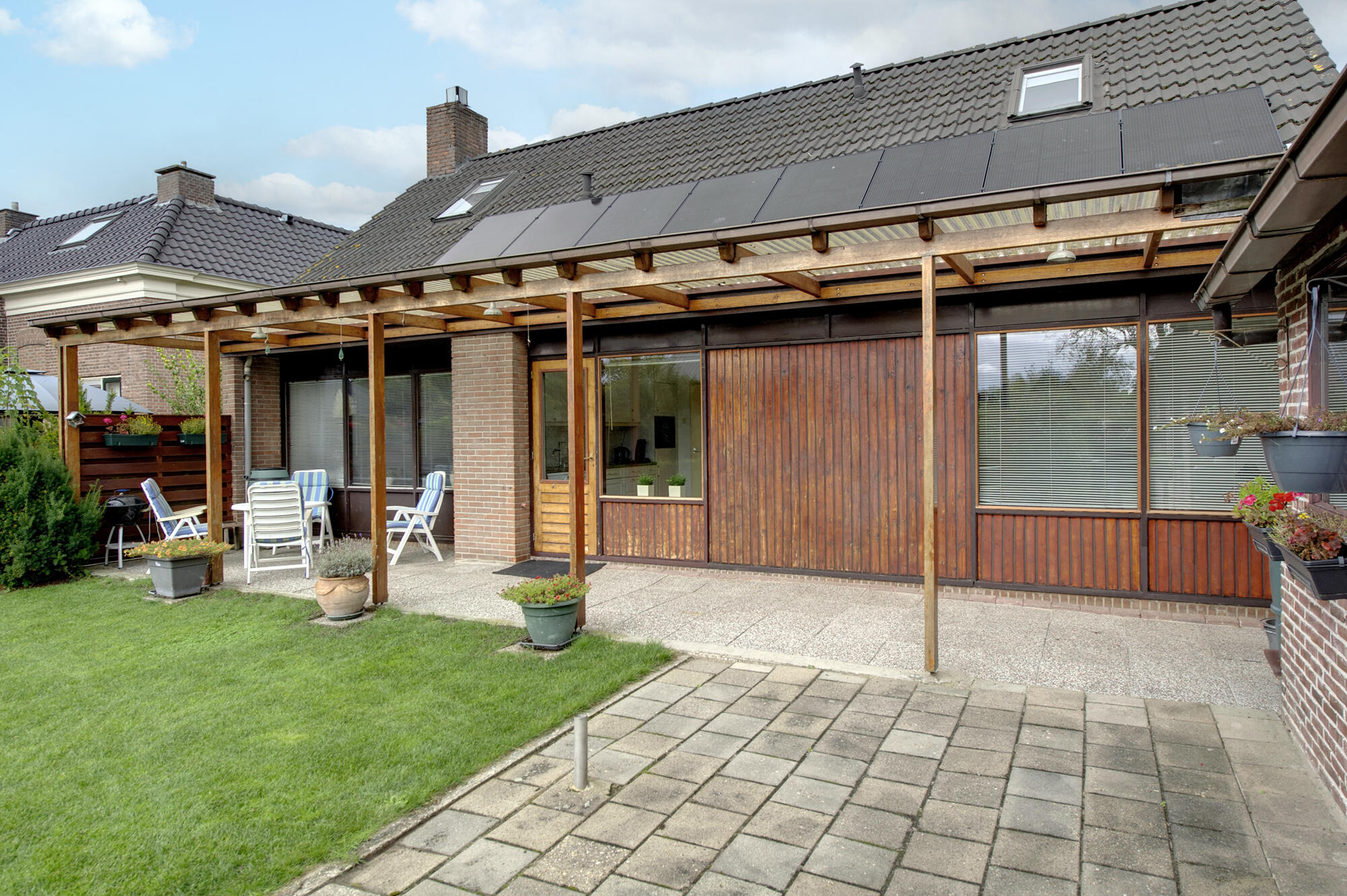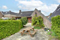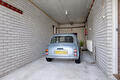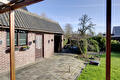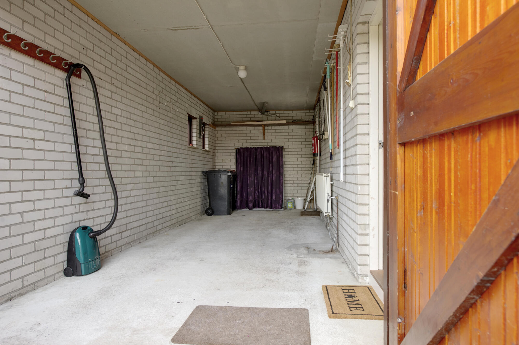 Achter de garage bevindt zich een aangebouwde stenen berging en een overkapping.