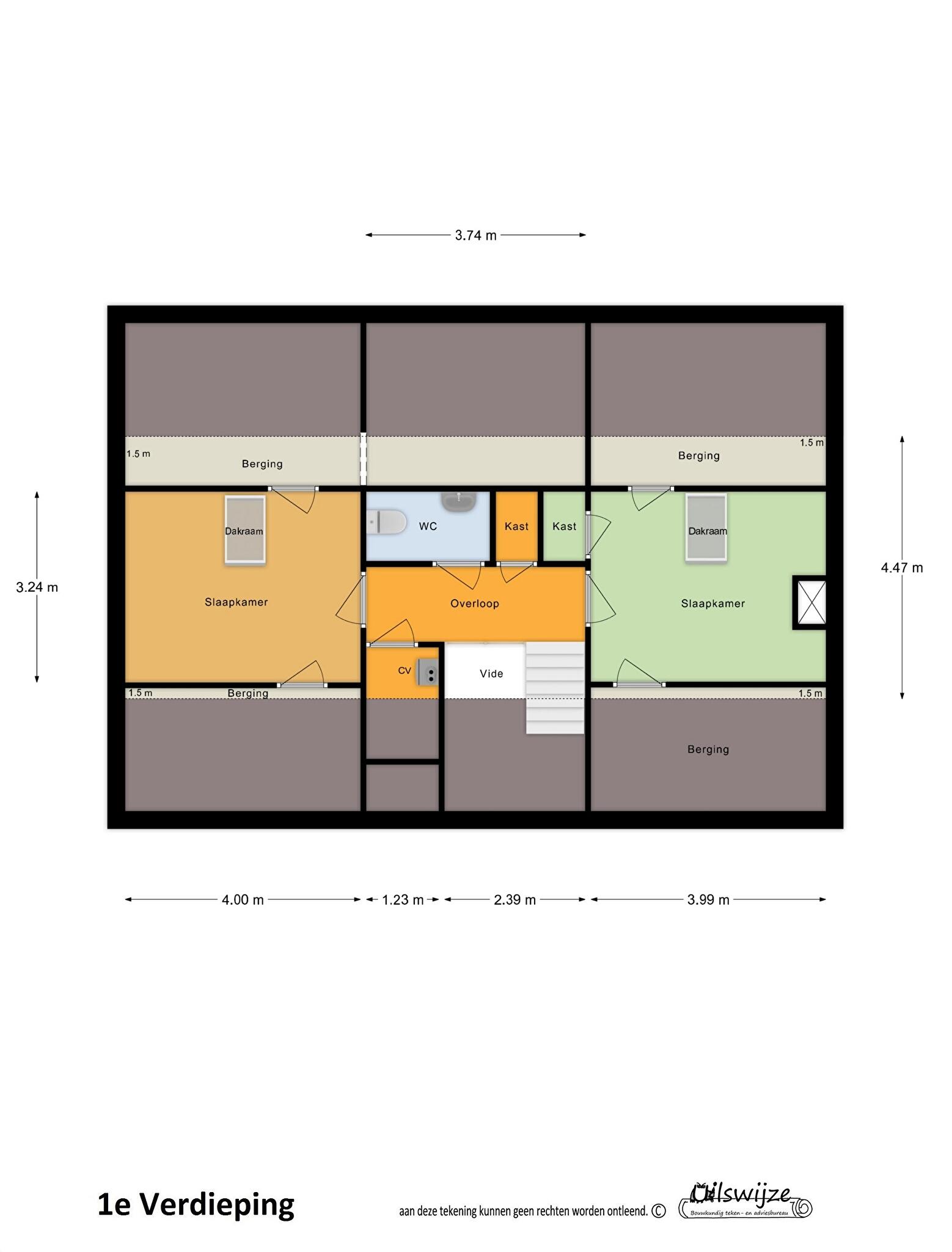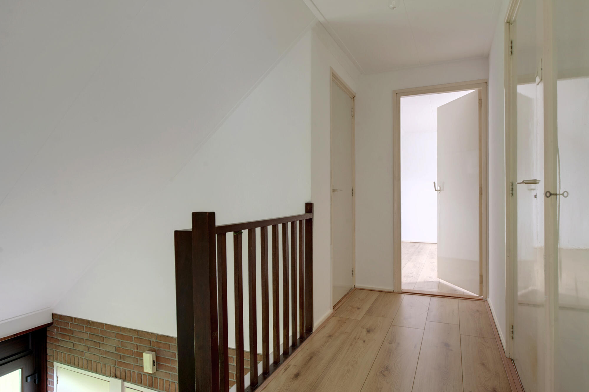 Op de verdieping bevinden zich naast de overloop nog 2 slaapkamers met toegang tot veel bergruimte naast de slaapkamers, een toiletruimte, een bergkast en stookruimte.