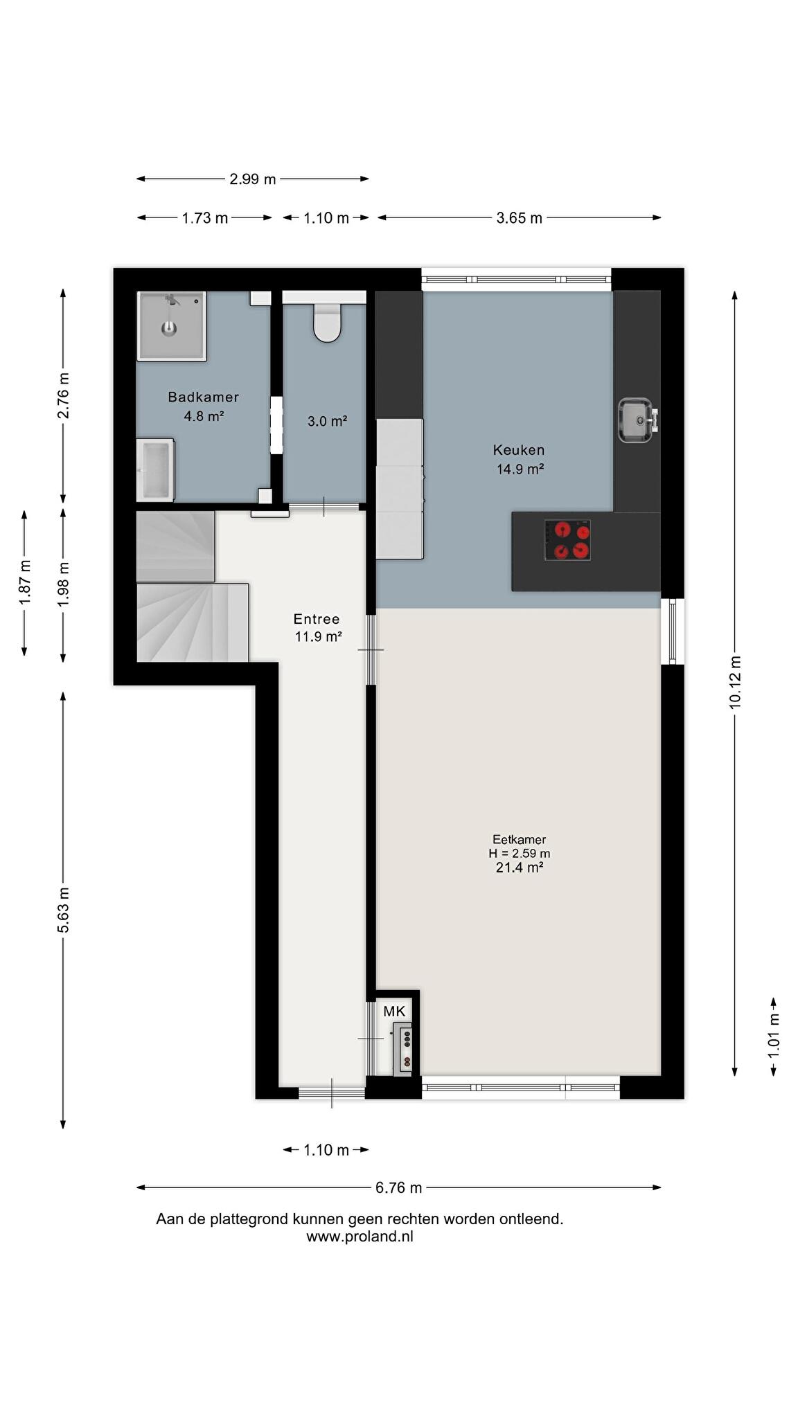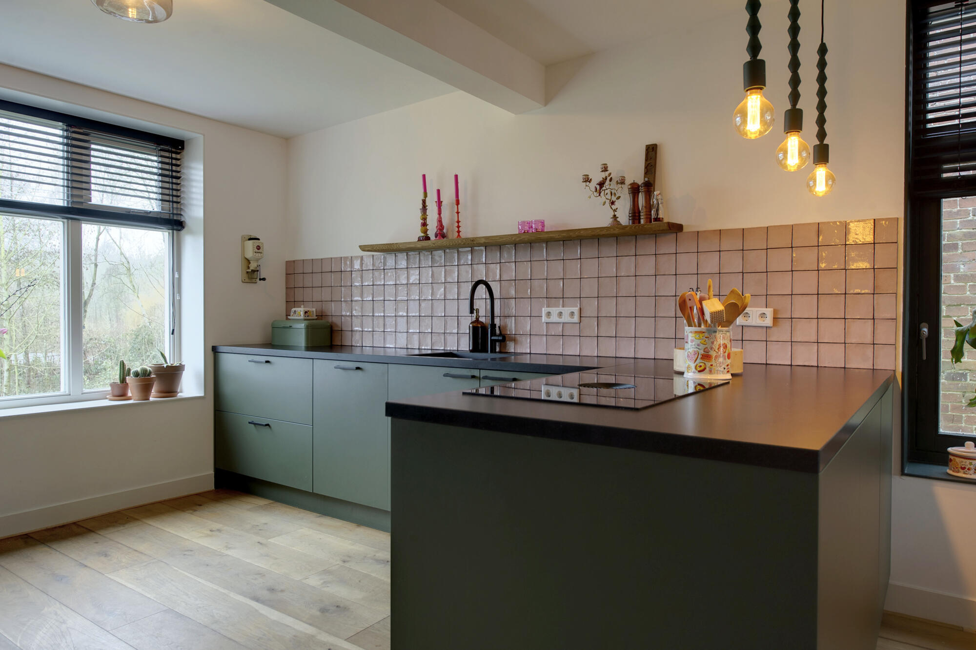Via de hal, met toegang tot zowel het souterrain als de verdieping, betreed je de woning. Op deze woonlaag bevindt zich de sfeervolle woonkeuken met eetkamer (totaal ca. 36 m²), een fijne centrale plek in huis. De moderne keuken is in 2025 geplaatst en is voorzien van diverse inbouwapparatuur (waaronder onder andere een Quooker, inductiekookplaat met downdraftafzuiging en een vaatwasser), wat zorgt voor optimaal kookcomfort.